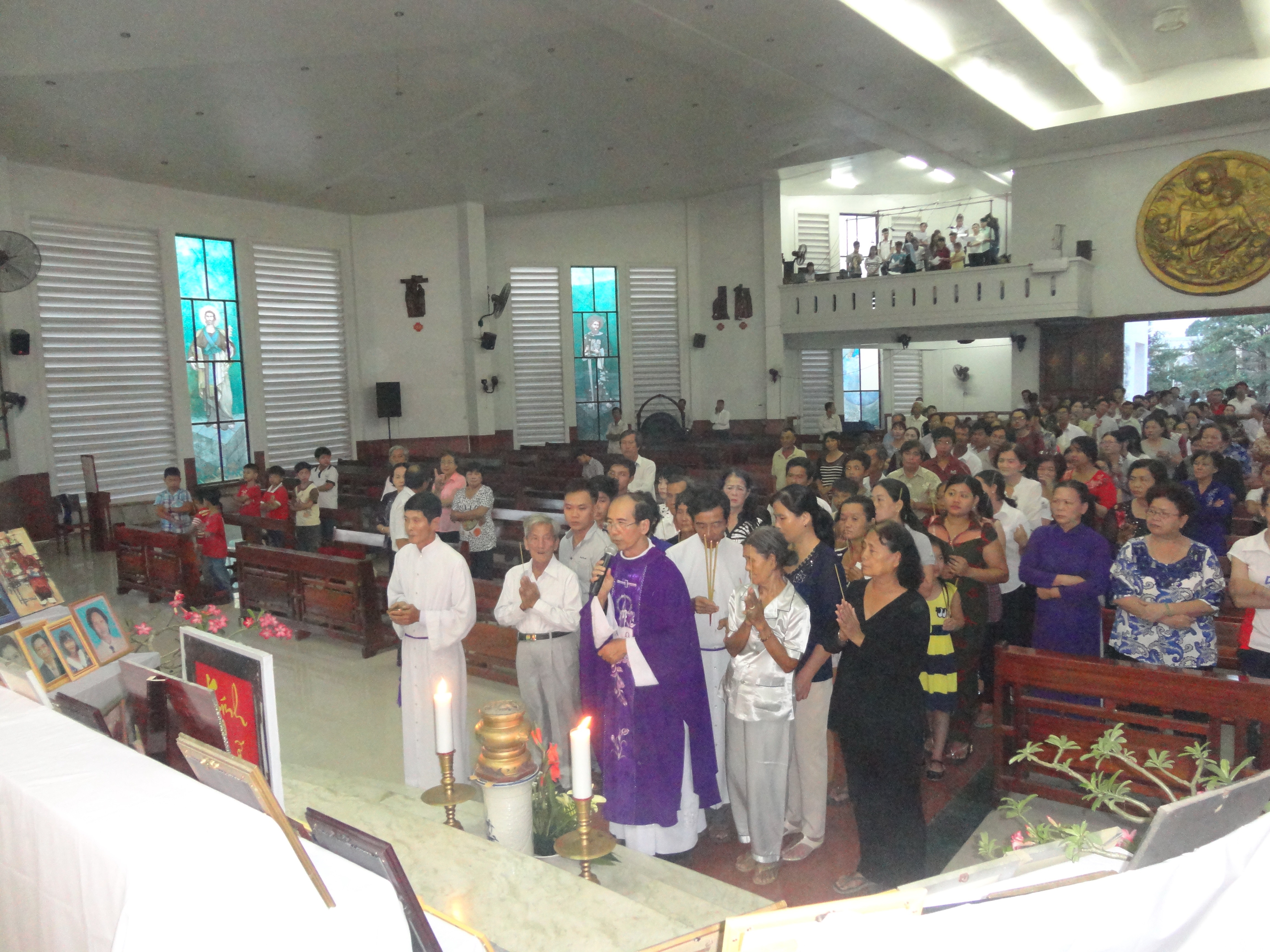 – Bàn thờ Tổ Tiên có hoa đèn và lư hương lớn ; hai bên là giá đặt các di ảnh bà con lương giáo đem tới, rải rắc phía trước là những lư hương nhỏ.